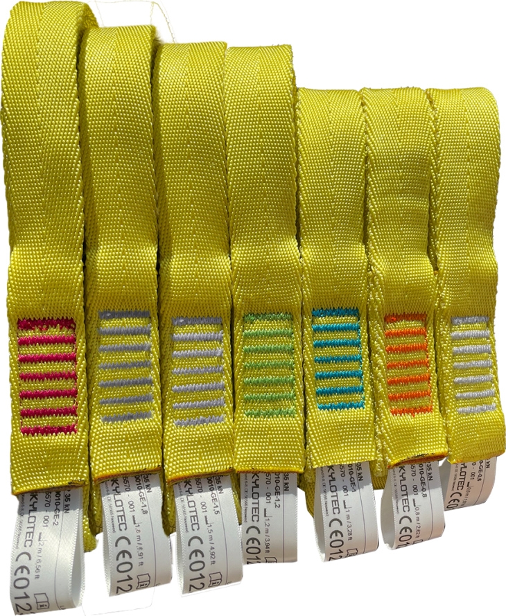 The webbing slings in black and yellow made of polyamide can be used as a mobile anchor point. The yarn colors are different to make it easier to distinguish between the different lengths. The slings are available in the following lengths: 0.6 m; 0.8 m; 1m; 1.2m; 1.5m; 1.8m; 2m. They also have a diameter of 25mm and a load capacity of 35 kN and are mainly used in the construction industry.